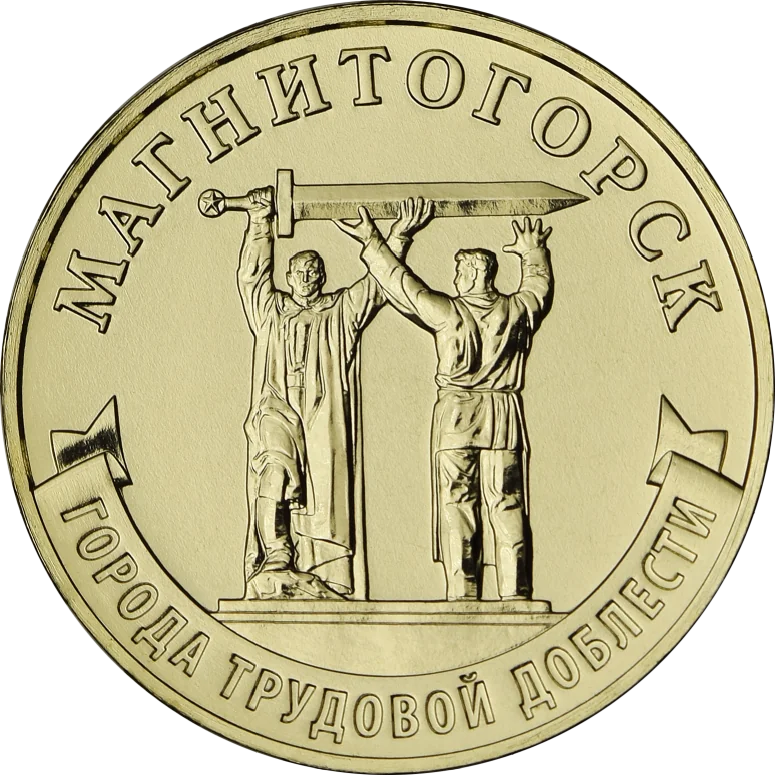 The reverse shows a relief fragment of the Rear-front Memorial, with "МАГНИТОГОРСК" above and "ГОРОДА ТРУДОВОЙ ДОБЛЕСТИ" on a ribbon below.