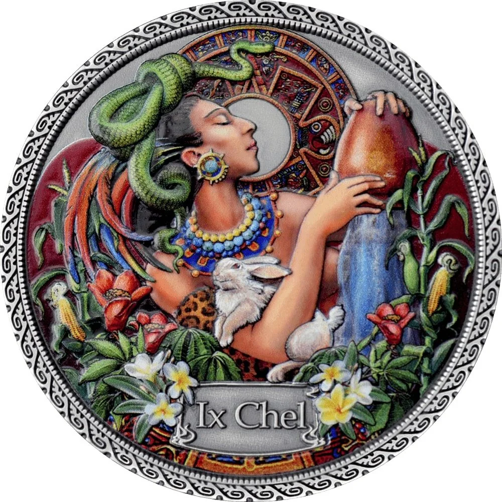 IX Chel: a sensual goddess of life and healing, pouring water with a rabbit and serpent headdress.