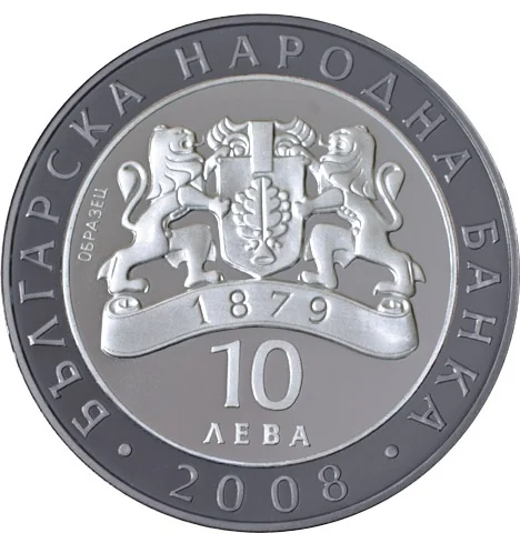 Description: Gilded center. Obverse: Bulgarian National Bank logo with "1879" on the ribbon, surrounded by the text "БЪЛГАРСКА НАРОДНА БАНКА," "10 ЛЕВА," and the issue year.