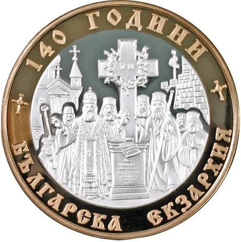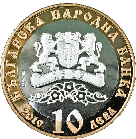 Description: Gilded ring coin. Obverse shows the Bulgarian National Bank logo with "1879" on its ribbon, encircled by "БЪЛГАРСКА НАРОДНА БАНКА," "10 ЛЕВА," and the issue year.