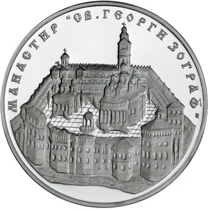 Description: The left side shows the Bulgarian National Bank logo with '1879' on its ribbon, the denomination '10 ЛЕВА', and the issue year '2011'. The right side features the icon of St. George Zograf from Zograf Monastery. The inscription 'БЪЛГАРСКА НАРОДНА БАНКА' encircles the coin.