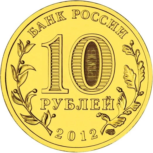 The coin's center shows "10 РУБЛЕЙ". Inside the "0", hidden images of "10" and "РУБ" appear as the angle changes. Around the rim: "БАНК РОССИИ" on top, "2012" below, with a stylized olive branch to the left and an oak branch to the right.