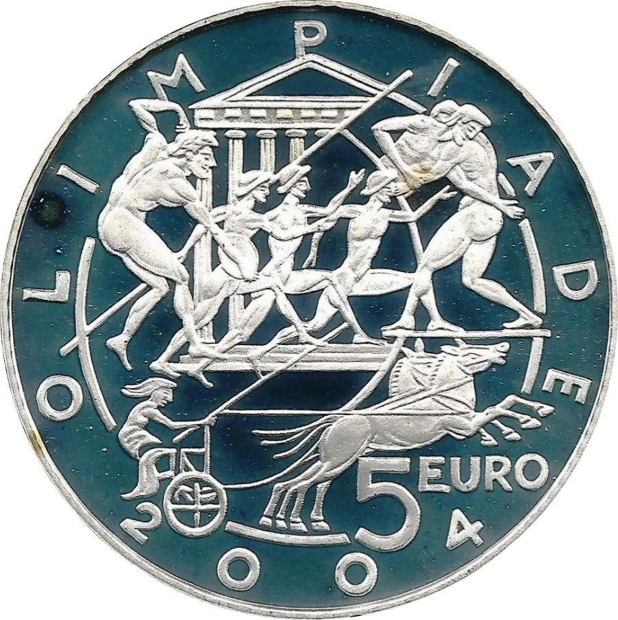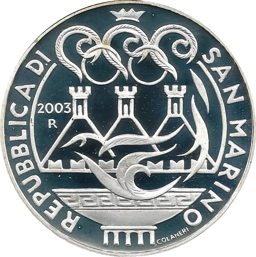 The coin features "REPUBLICA DI SAN MARINO" and artist Maria Carmela Colaneri. Its central design shows three feather-topped towers, evoking Olympic rings, above a stylized basin with the Olympic flame and a peace dove.