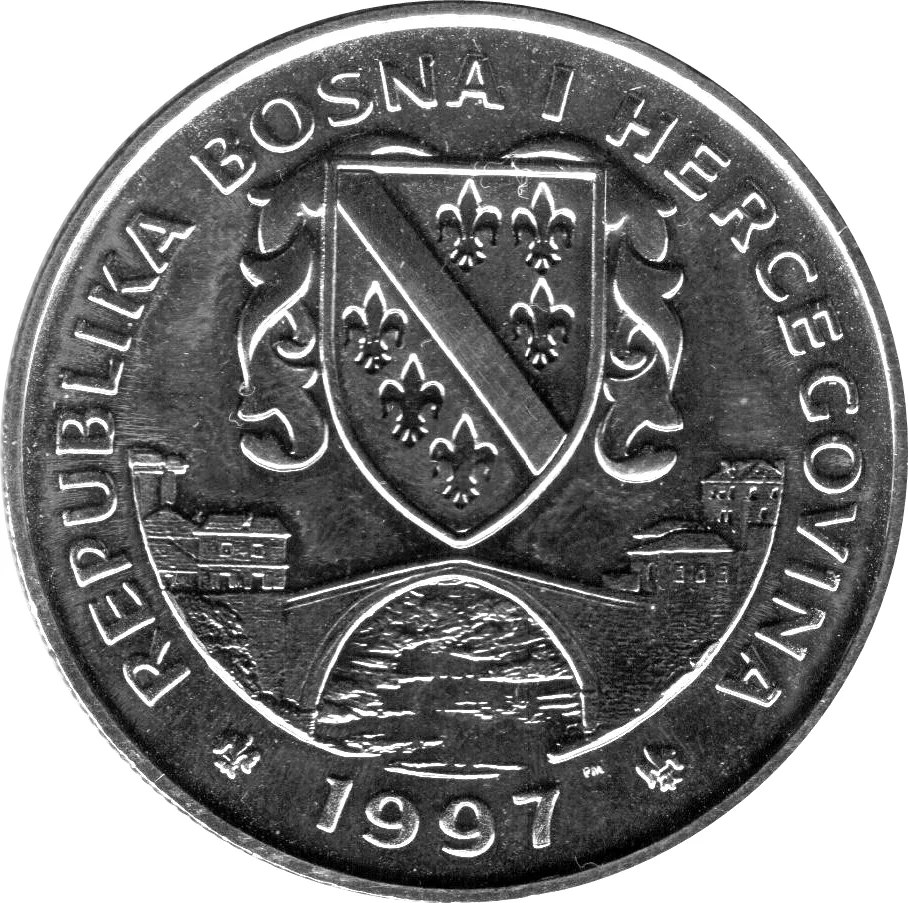 Bosnian coat of arms above Mostar Bridge. Mintmark (PM) to the right of the date.