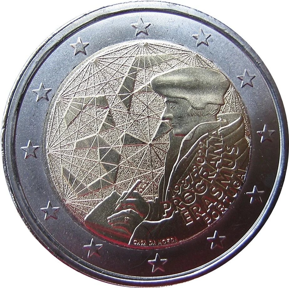 A Western Europe map spans the coin's right side, with "2 EURO" overlaid—the "2" in the Atlantic. Twelve stars flank the map, six above and six below, connected by six vertical stripes across the inner core.