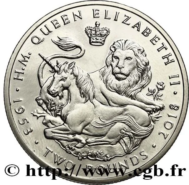 A crown above a lion and unicorn resting among UK national plants, with the value below between 1953 and 2018.