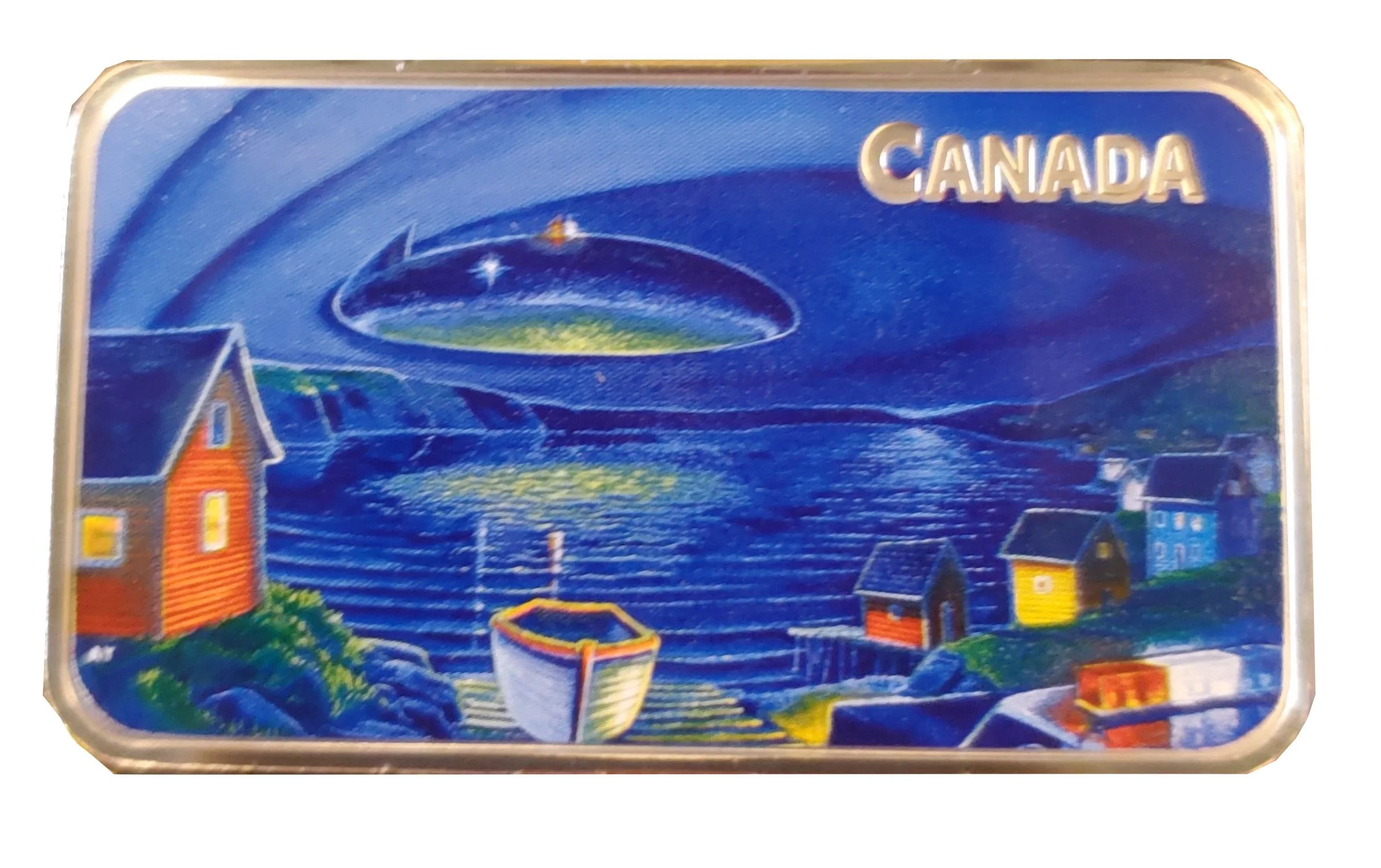 Adam Young’s reverse design depicts a 1978 Clarenville, N.L. UFO event from the witnesses' viewpoint. It shows the oval craft hovering over Random Sound on a clear night, with an RCMP cruiser below. Using black-light technology, the UFO and its water reflection glow brightly.