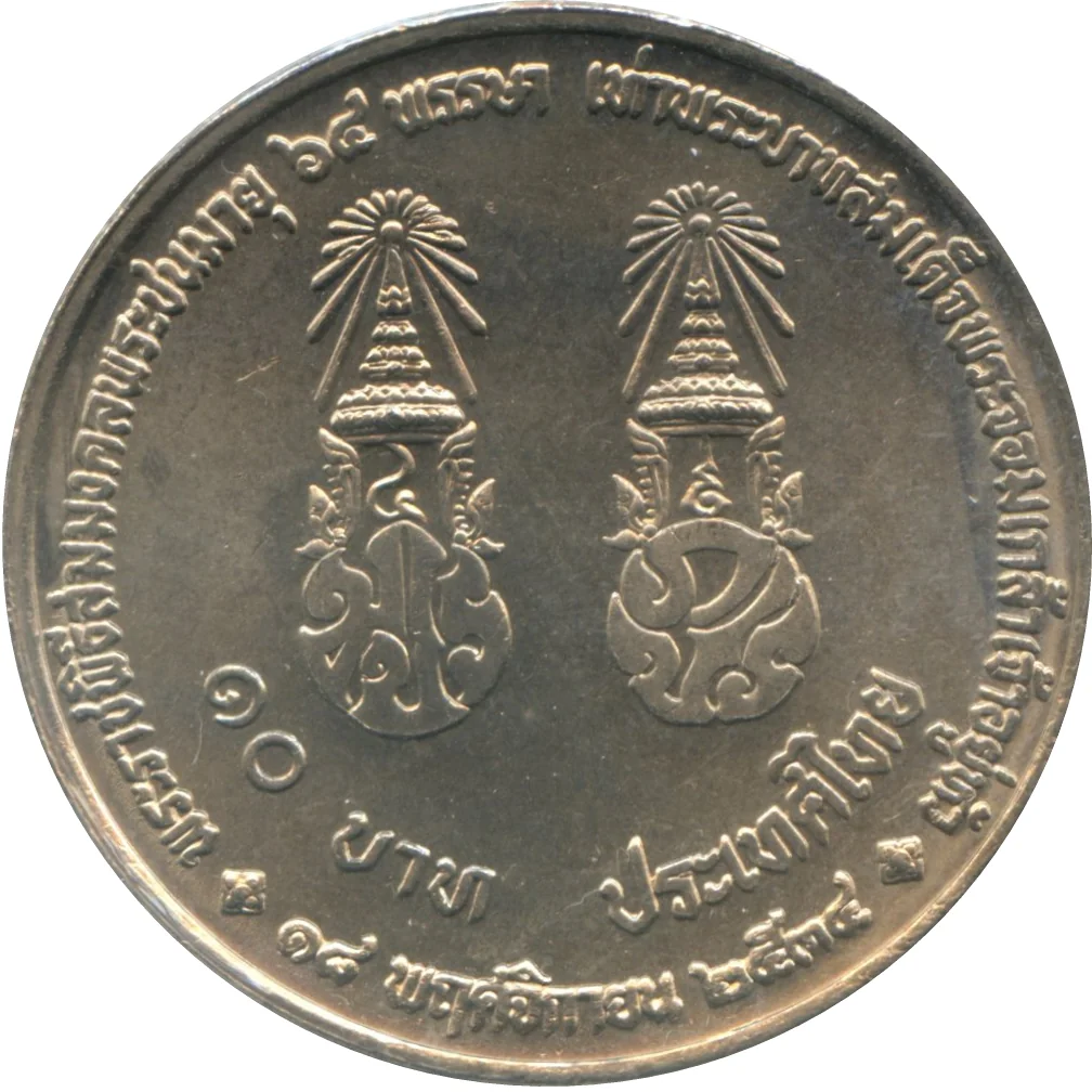 Conjoined busts of Kings Mongkut and Bhumibol facing half-left. Mongkut wears the Legion of Honour and Order of Nine Gems. Bhumibol wears royal attire with the Orders of the Royal House of Chakri and Chula Chom Klao. Their names flank two intertwined Chakri emblems.