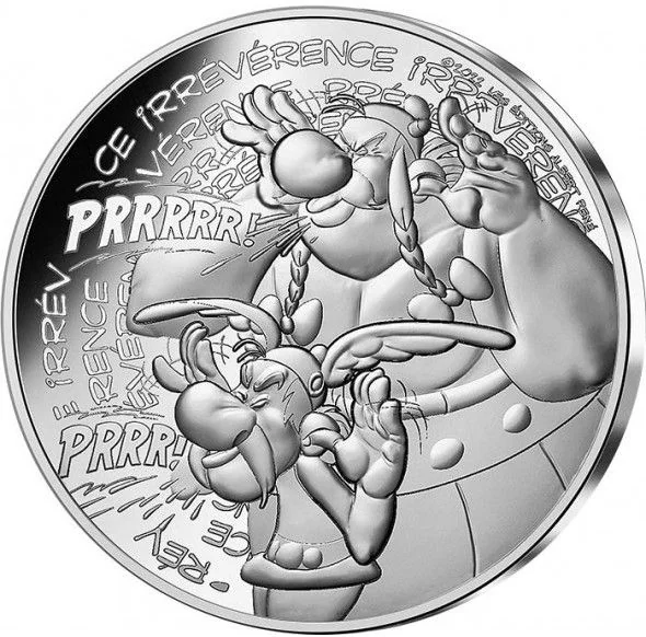 Asterix and Obelix sticking out their tongues, with "IRREVERENCE" repeated in the background.