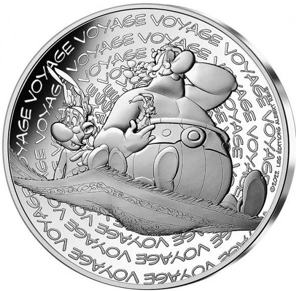 Asterix, Obelix, and Dogmatix flying a magic carpet to India.