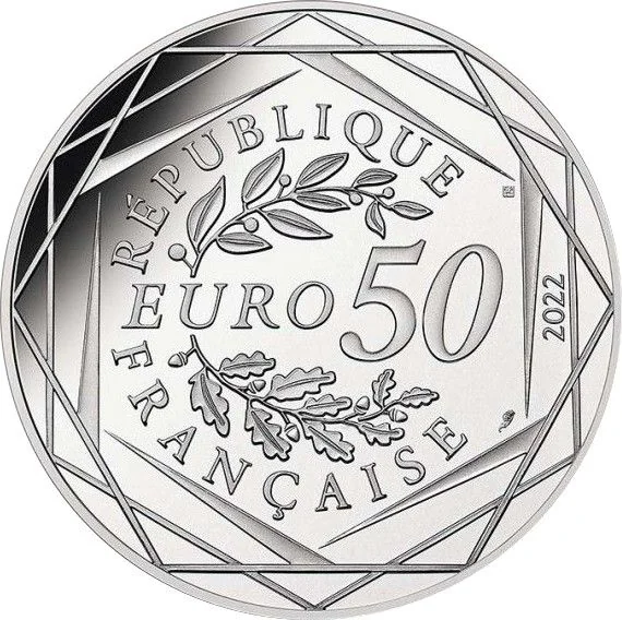 "50 EURO" flanked by laurel and oak branches, encircled by "RÉPUBLIQUE FRANÇAISE" and three hexagons.