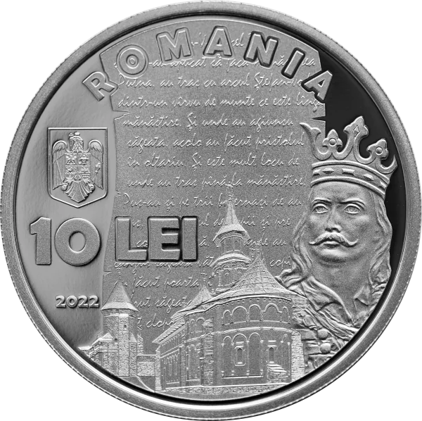 A partial image of Putna Monastery and a portrait of Ștefan cel Mare over text from Ion Neculce's "O samă de cuvinte," with an arched "ROMANIA," the Romanian coat of arms, "10 LEI," and "2022."