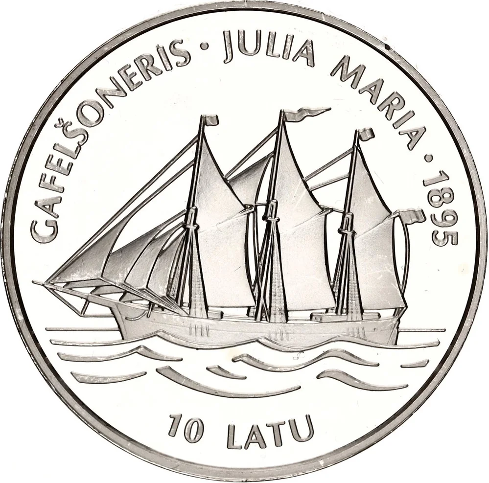A sailing ship is centered, with "GAFELSONERIS · JULIA MARIA · 1895" arched above it. Below are the numeral 10 and "LATU".