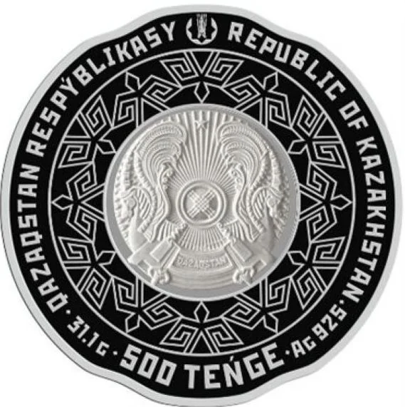 Inscription: • QAZAQSTAN RESPÝBLIKASY • 31.1 g • 500 TENGE • Ag 925 • REPUBLIC OF KAZAKHSTAN