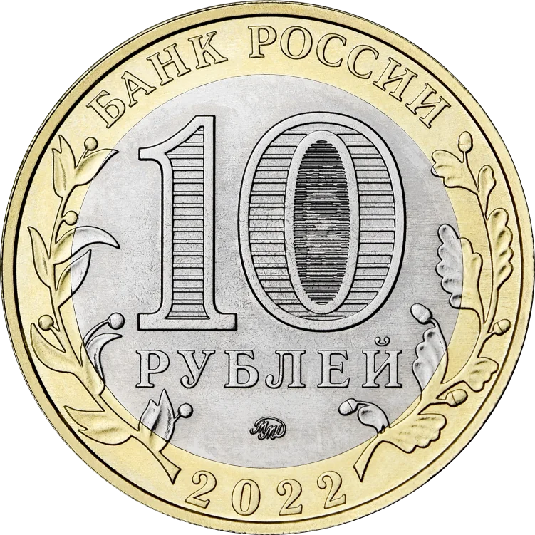 The obverse features "БАНК РОССИИ" at the top and "2022" at the bottom along the outer ring, flanked by laurel (left) and oak (right) branches extending onto the disc. The central disc displays the face value "10 РУБЛЕЙ". Inside the '0' is a security element showing "10 РУБ" from different angles. The Moscow Mint mark is at the disc's bottom.