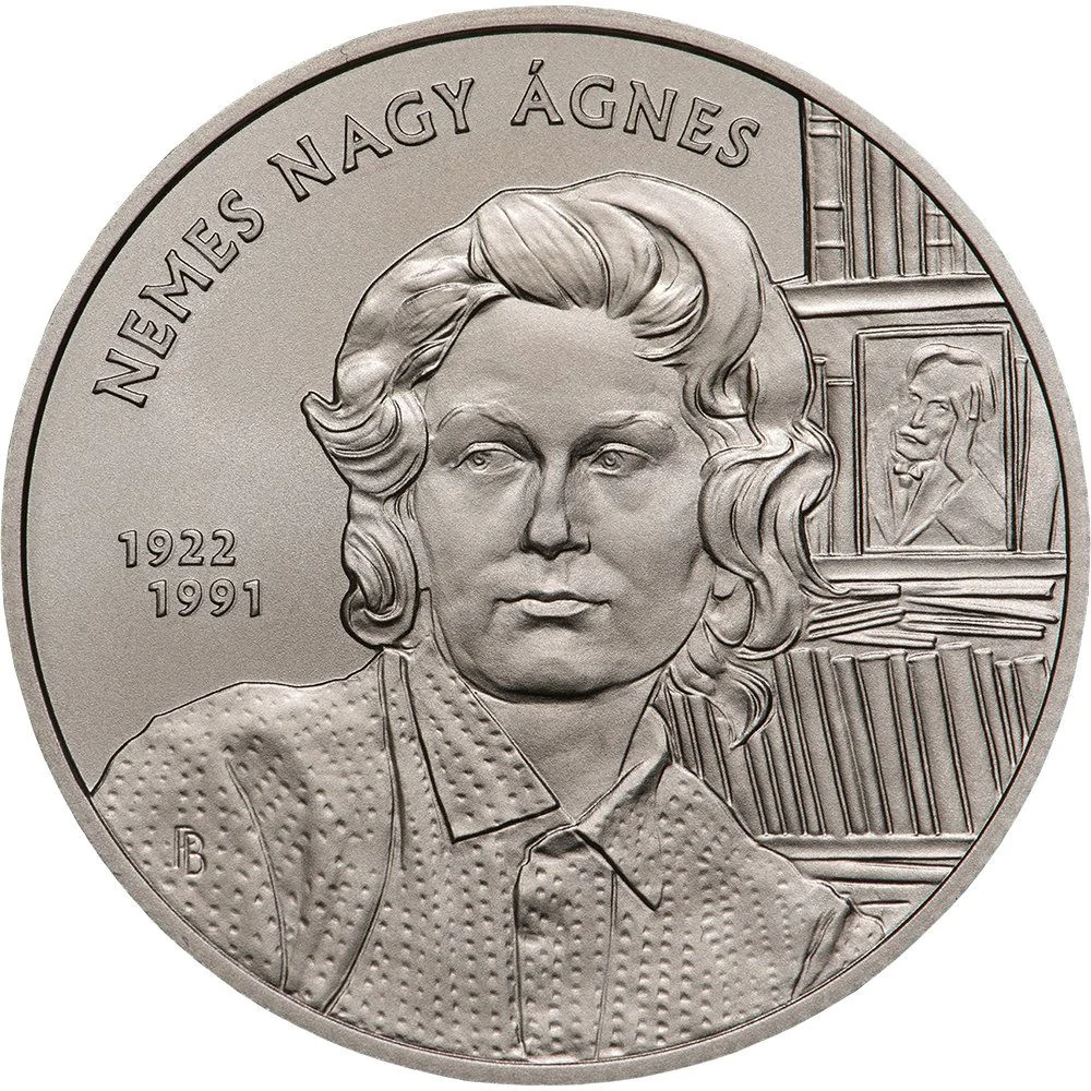 The reverse features a portrait of Ághes Nemes Nagy before a bookshelf, with a portrait of Mihály Babits among the volumes. Her name and lifespan (1922 1991) are inscribed at upper left. The designer, sculptor Balázs Pelcz, hid his mark in the folds of her clothing.