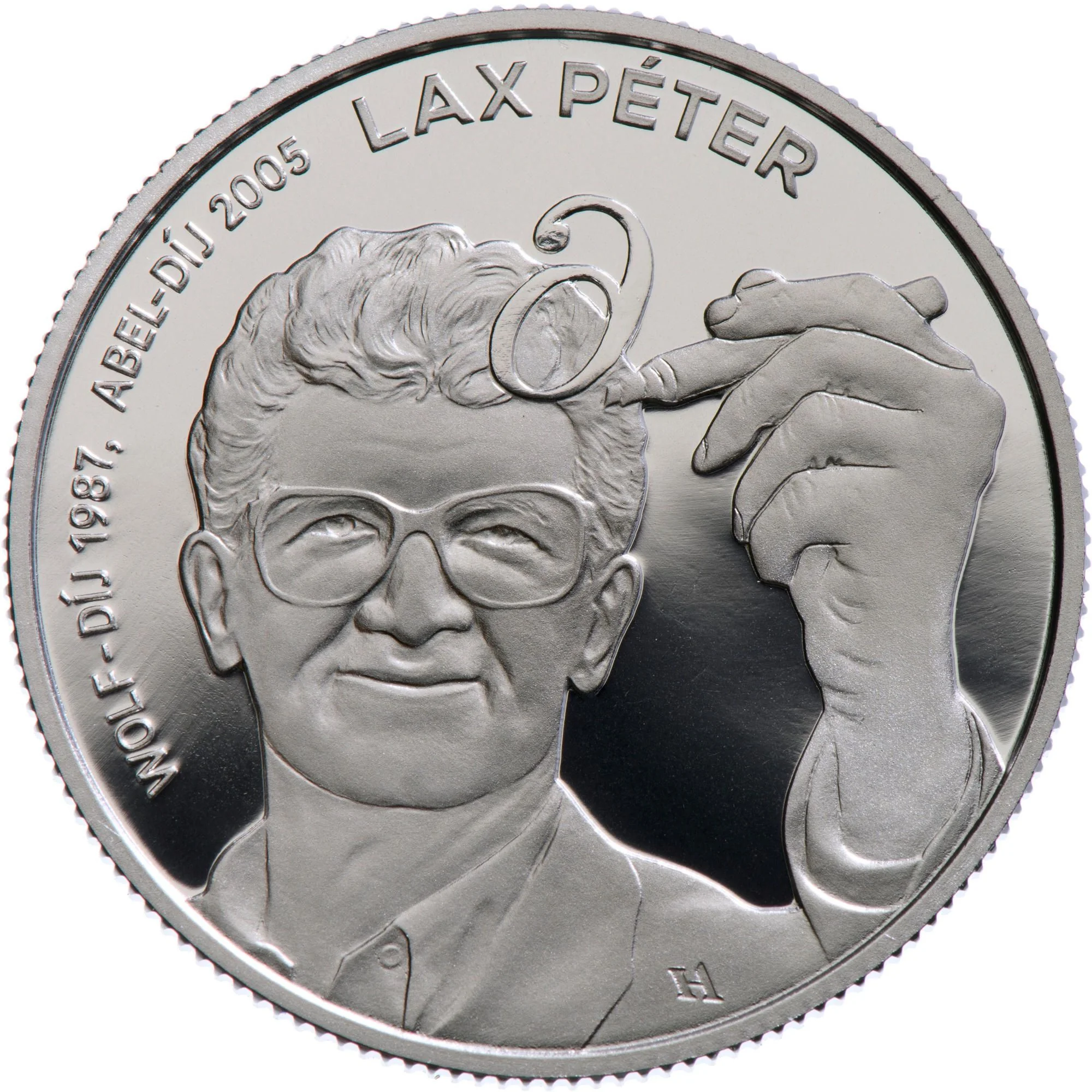 The reverse depicts Peter Lax writing on an imaginary blackboard, with the designer Andrea Horváth's master mark at the bottom edge.