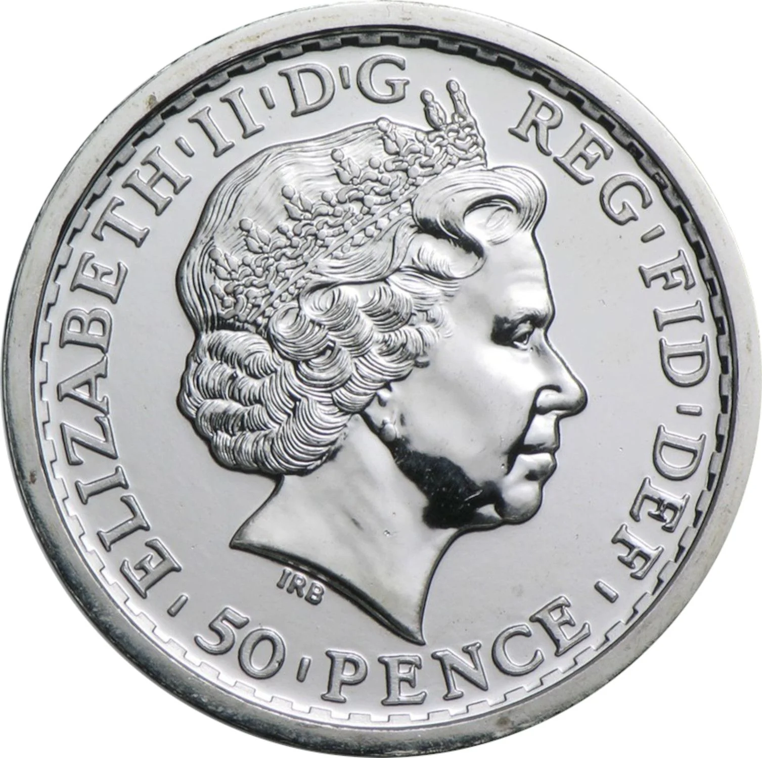 Britannia standing with trident, shield, and olive branch, surrounded by legend. Plain fields.