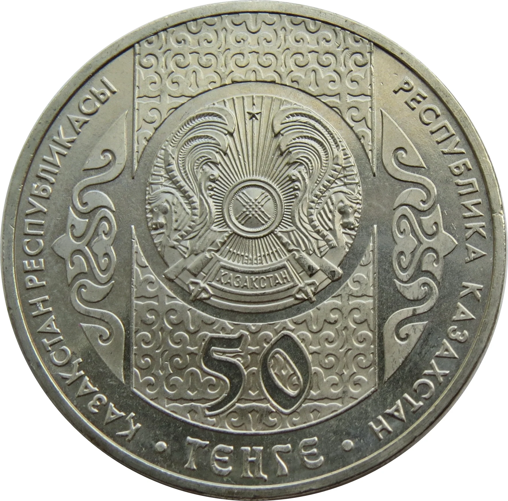Description: Kazakhstan's State Emblem on an ornamental background with the face value "50 ТЕҢГЕ," national patterns, and the country's name in Kazakh and Russian.