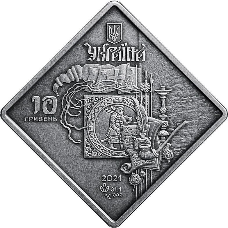 The coin features Ukraine's small coat of arms above the word "УКРАЇНА." The left side shows the face value "10/ГРИВЕНЬ," while below are the year 2021, weight 31.1g, metal "Ag 999," and the mint mark. The central design displays Cossack regalia and artifacts evoking the historical period.