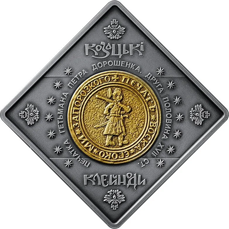 Hetman seals with local gilding, a key Cossack regalia of Ivan Skoropadskyi. Legends: "КОЗАЦЬКІ" (above), "КЛЕЙНОДИ" (below), with the owner's name encircling the seal.