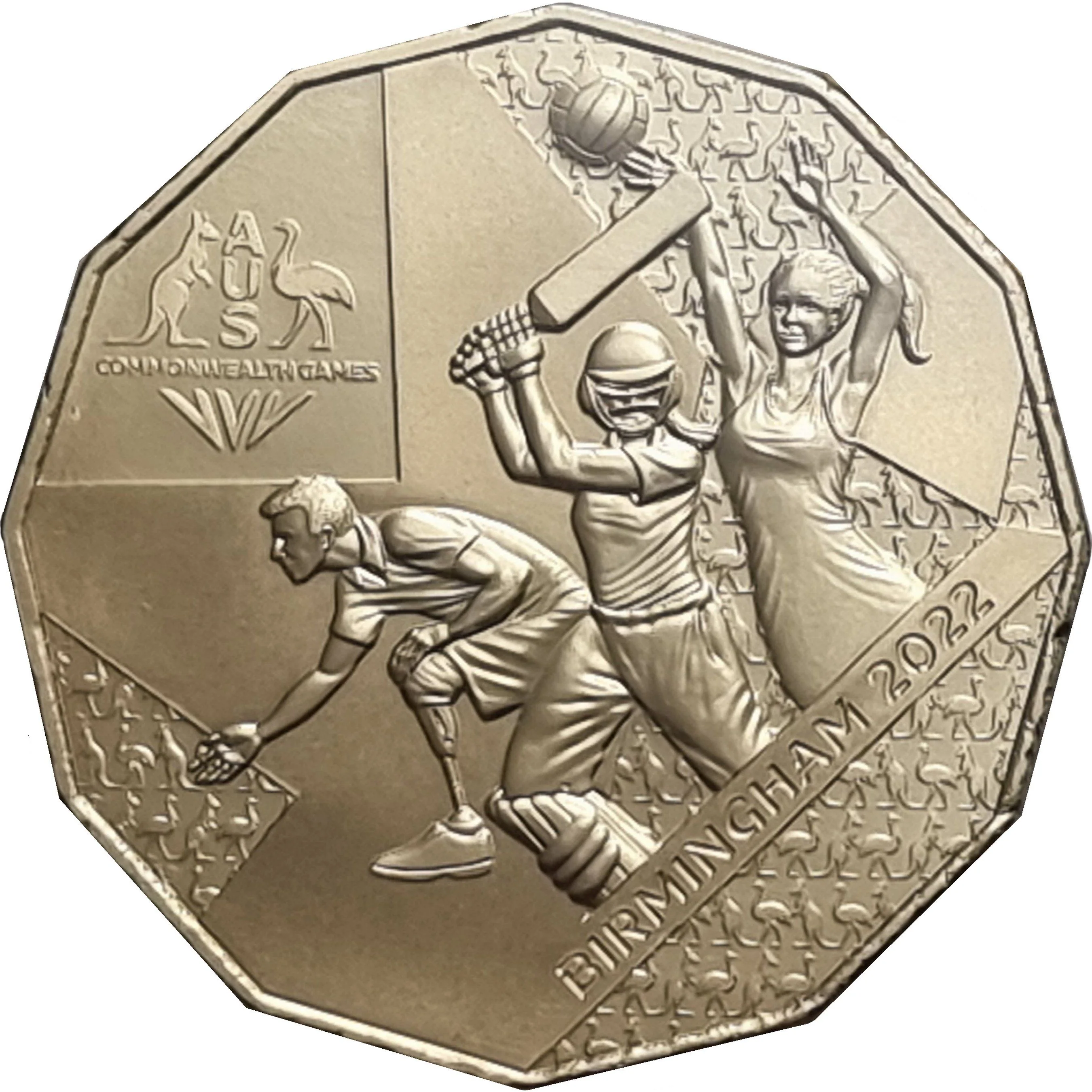 The Australian Commonwealth Games team logo, with a lawn bowler, cricketer, and netballer in front of a background of miniature kangaroos and emus.