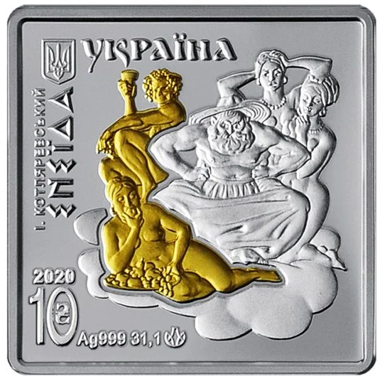 The obverse features Ukraine's small coat of arms and "УКРАЇНА." Below are the year 2020, face value 10 (with ₴ inside the zero), metal specifications Ag 999, 31.1, and the NBU mint mark. Vertical text reads: І. КОТЛЯРЕВСЬКИЙ/ЕНЕЇДА.