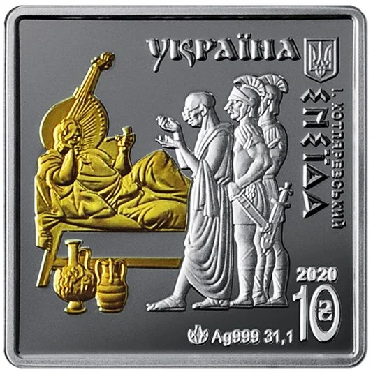 The obverse features Ukraine's small coat of arms and "УКРАЇНА." Below are the year 2020, face value 10 (with ₴ inside the zero), metal specifications Ag 999, 31.1, and the NBU mint mark. Vertical text reads: І. КОТЛЯРЕВСЬКИЙ/ЕНЕЇДА.