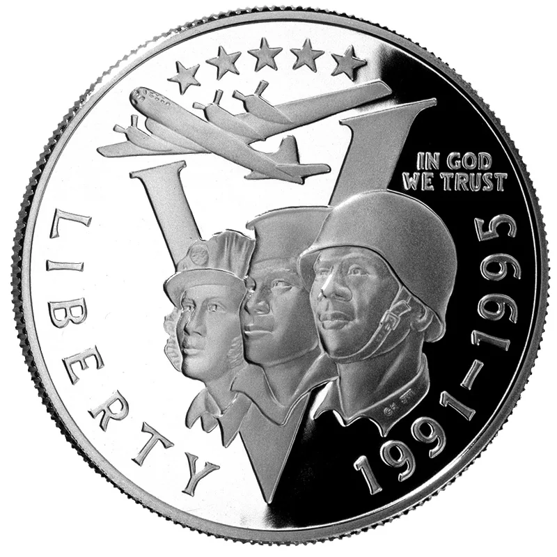 A soldier, sailor, and airman look up at a B-17 bomber flying left, with a "V" in the background, all within a surrounding legend.