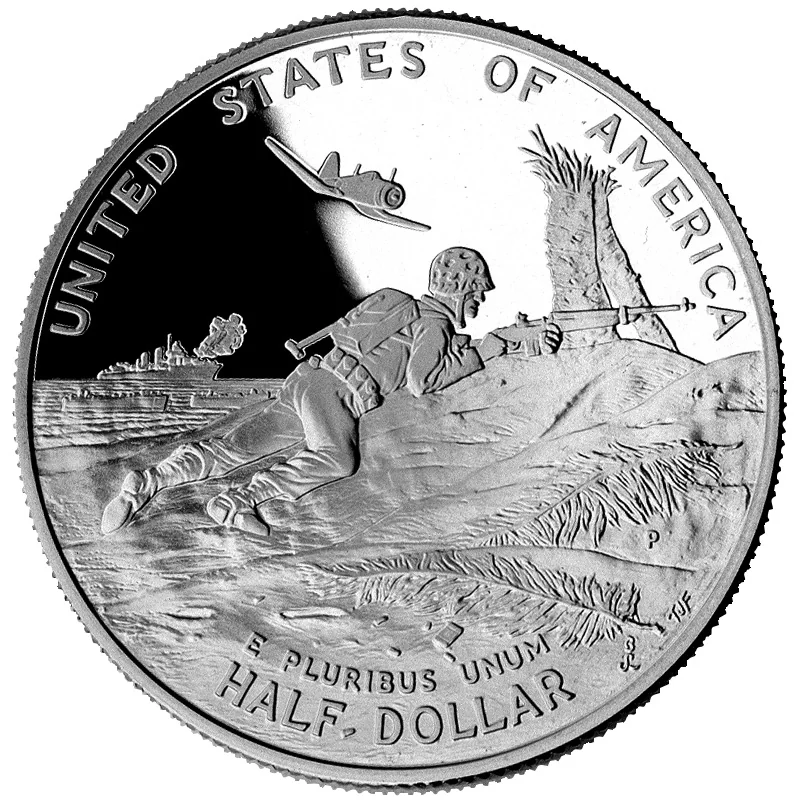Soldier prone on beach with rifle, facing right. A plane flies above; three boats are in the water to the left, with foliage to the right. Legend and denomination text surround the scene.