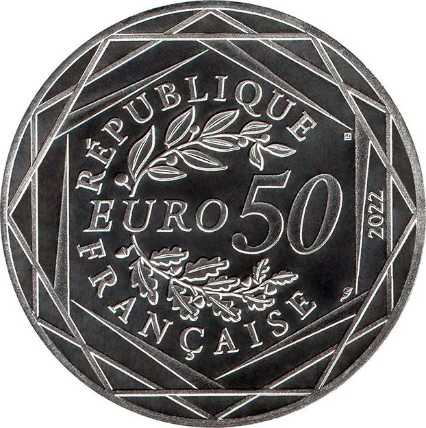 "50 EURO" flanked by laurel and oak branches, encircled by "RÉPUBLIQUE FRANÇAISE" and three hexagons.