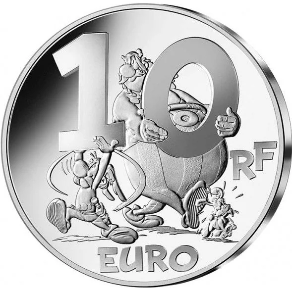 The coin's trio: Asterix and Obelix hold its numerals, accompanied by Dogmatix.