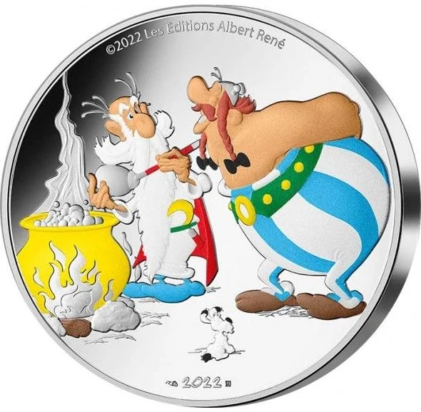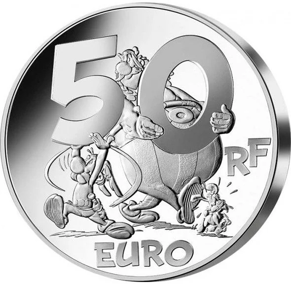 The coin's trio: Asterix and Obelix hold its numerals, accompanied by Dogmatix.