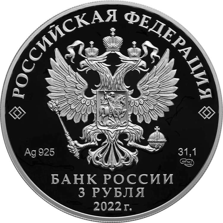 The obverse features the Russian Federation coat of arms with "РОССИЙСКАЯ ФЕДЕРАЦИЯ" above, flanked by diamonds. Below are the metal details and mint mark. The bottom displays "БАНК РОССИИ", "3 РУБЛЯ", and "2022 г." in three lines.