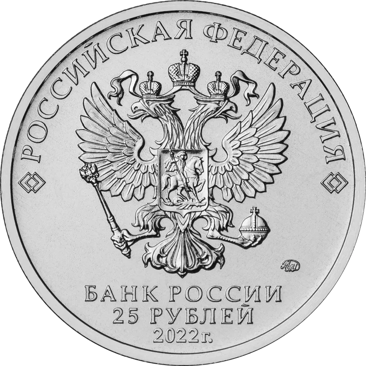 The obverse features the Russian Federation coat of arms with "РОССИЙСКАЯ ФЕДЕРАЦИЯ" above it. Below are the inscriptions "БАНК РОССИИ", "25 РУБЛЕЙ", and "2022 г.", with the mint mark to the right.