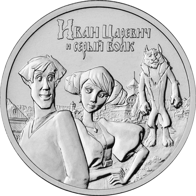 Relief characters from 'Ivan Tsarevich and the Grey Wolf' against the Far Far Away Kingdom panorama, with the film's title in relief above.