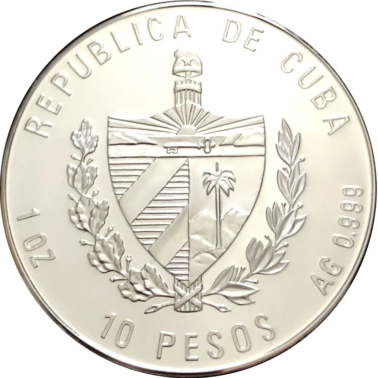 Cuban coat of arms at center, country name above, face value below, weight and fineness on sides. Modified from KM# 823 with updated value and added metal details.