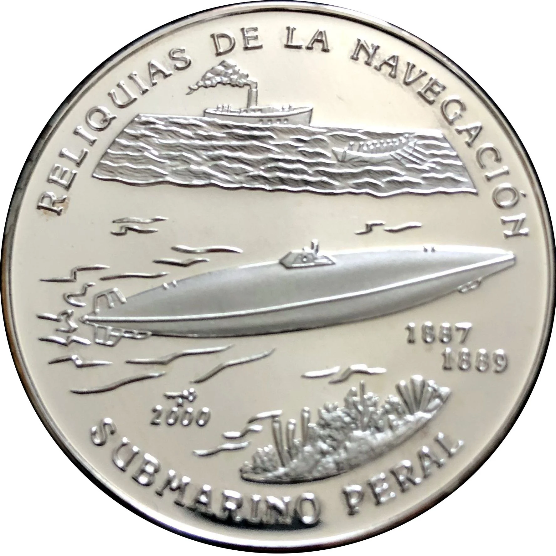 Ship, lifesaver boat, and Peral submarine. Years of operation on right; issue year and mintmark lower left. Design matches KM#823.