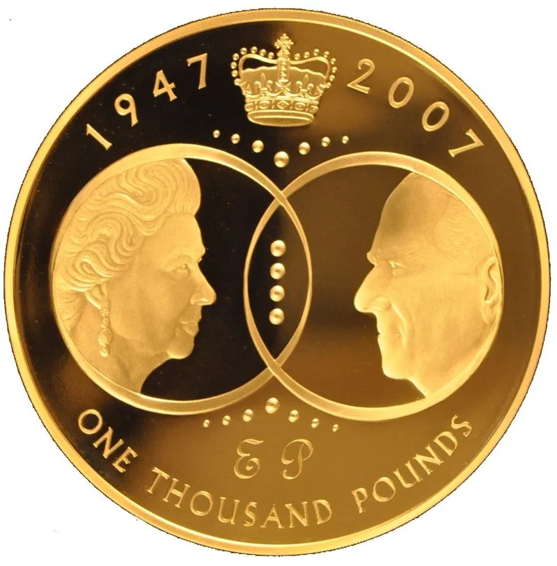 Heads of Elizabeth II and Philip left, crowned dates above, rings and monogram below.