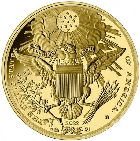 The U.S. seal features a bald eagle, its wings spread, holding an olive branch and thirteen arrows. Above it, thirteen stars pierce the clouds, symbolizing the original states and the nation's commitment to peace and defense.