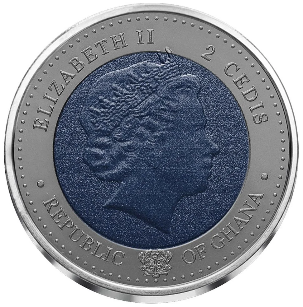 Queen Elizabeth II on colored inner ring; outer ring with lettering and Ghana's coat of arms.