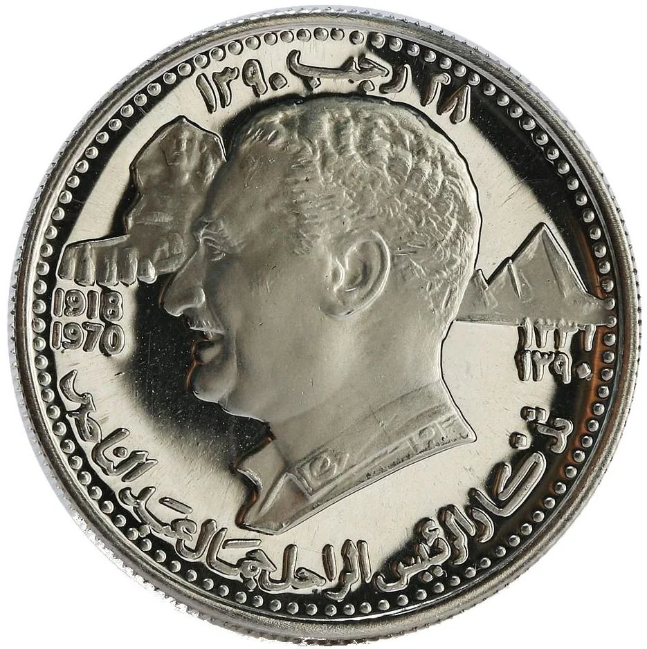 Description: Nasser's profile centered, with the Sphinx left and pyramids right.