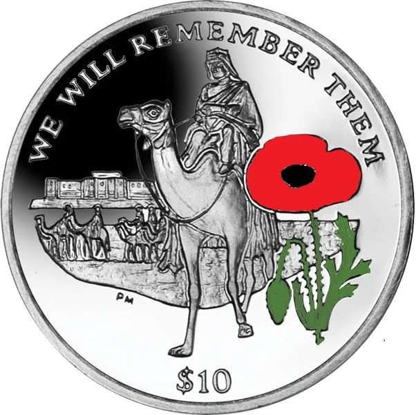 Lawrence of Arabia on a camel before Aqaba, a poppy to the right.