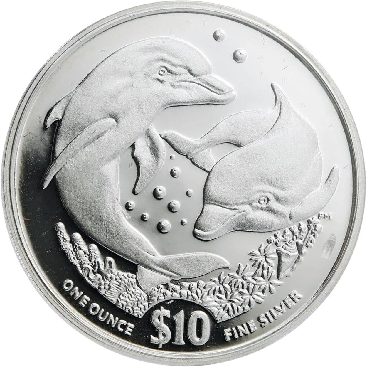Two dolphins over a reef with denomination below.