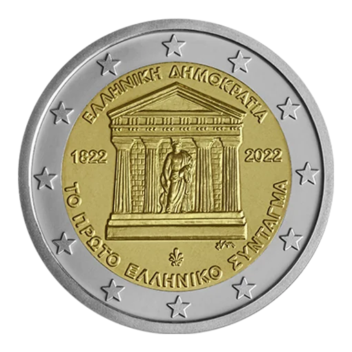 The design depicts the temple of Asclepius at Epidaurus, replicating a medal from the First National Assembly held there. It features the inscriptions ‘HELLENIC REPUBLIC’, ‘THE FIRST GREEK CONSTITUTION’, the years ‘1822’ and ‘2022’, a palmette mintmark, and the artist’s monogram. The outer ring bears the 12 stars of the European flag.
