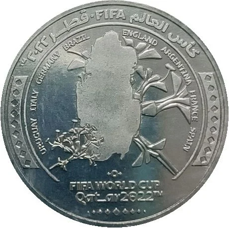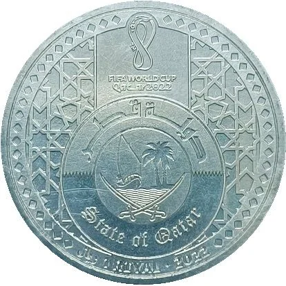 Qatar's emblem features crossed curved swords, a dhow sailing on waves, and a palm-tree-lined island.