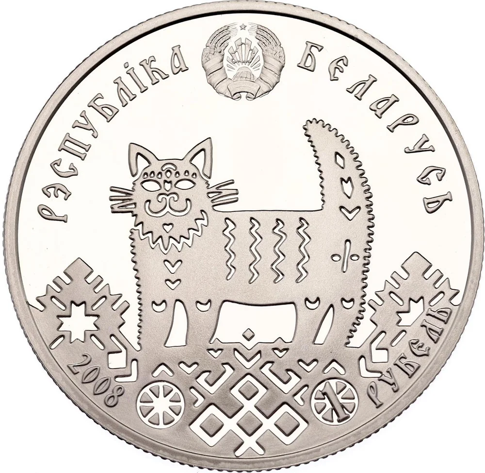 Reverse: A cat standing on a semicircular base with symbols of the sun, fire, and hearth. Below: the year of issue and "1 РУБЕЛЬ".