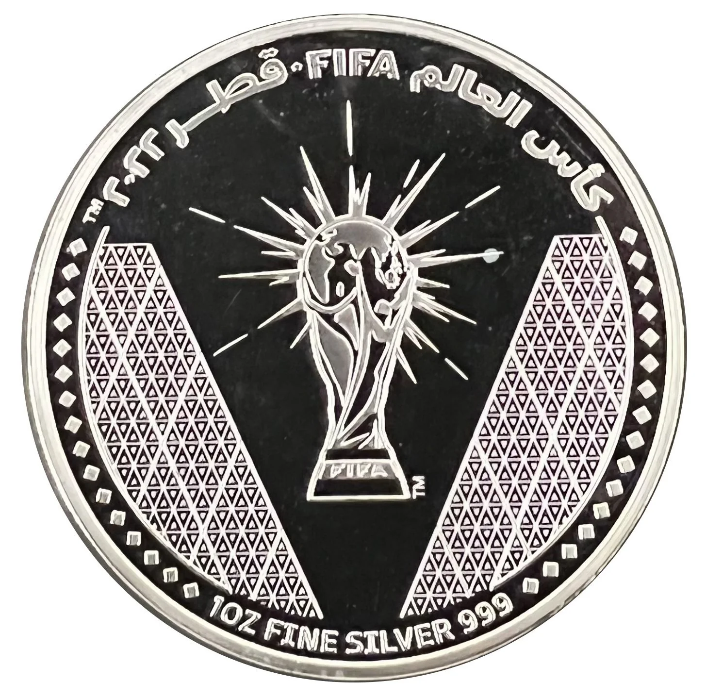 Description: Qatar coat of arms with FIFA World Cup 2022 logo above, on a decorative background. Value and date below.