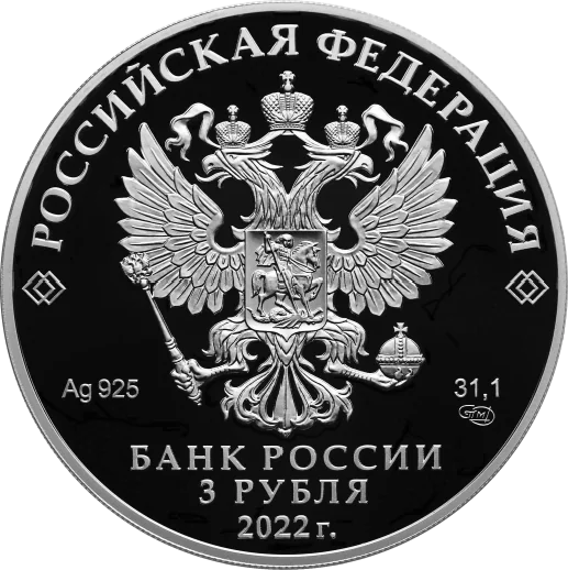 The obverse features the Russian Federation coat of arms, inscriptions for "Russian Federation" and "Bank of Russia," the denomination "3 Roubles," the issue year "2022," the metal's chemical symbol, fineness, mint mark, and fine metal content.