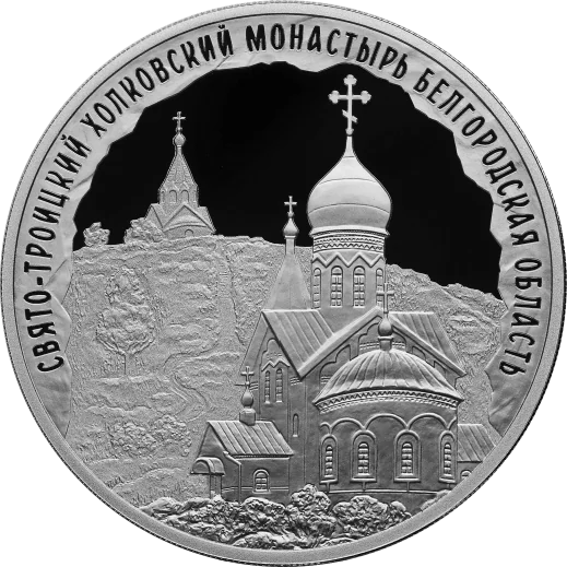 The reverse depicts the Kholki Monastery in relief, with the inscription ‘СВЯТО-ТРОИЦКИЙ ХОЛКОВСКИЙ МОНАСТЫРЬ БЕЛГОРОДСКАЯ ОБЛАСТЬ’ along the upper edge. The textured background mimics the chalk walls of the monastery's caves.